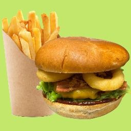 Pain artisanal label rouge, roquette, cornichons, confit d'oignons, champignons, steak beyond meat, fromage vegan et 1 sauce au choix. Servi avec frites maison et 1 sauce au choix.
