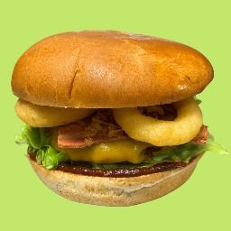 Pain artisanal, sauce spicy barbecue chipotle, salade, cornichons, oignons frits, steak beyond meat, onion rings, bacon vegan, cheddar vegan. Servi avec frites maison et une sauce au choix